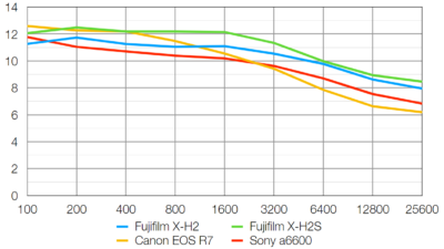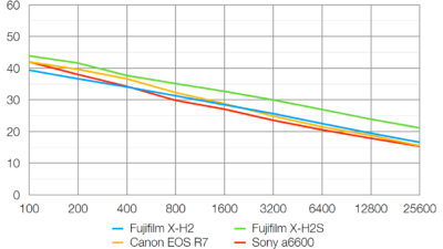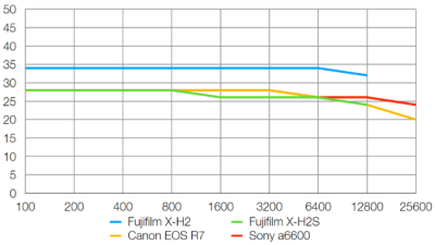 こちらは ISO感度を上げていった場合の解像度の変化を表しています。この解像度テストから見えてくるのは、他社の APS-C カメラよりも解像度が高いということ。EOS R7 は 3250万画素ありますが他のカメラと解像度の差がありません。それを考えると X-H2 はかなり優秀でしょう。そして ISO6400 まではその解像度を維持しているということです。