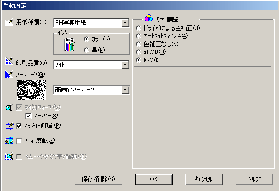 プリンタドライバでは、カラー調整で「ICM」を選びます。