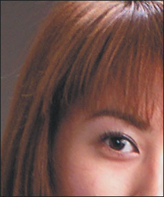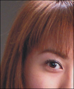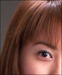 画面では用紙の色をシミュレートしているので、かなりいい線に見えますが、実際のプリントではもっと差があります。特にフラットスキャナで作成したプロファイルでは全般的に彩度が高く、特に茶髪の髪の毛が不自然な感じになります。さらに細かく見ると額の髪の毛の影、耳周辺のシャドーが不自然で、肌の階調も飛び気味です。しかも、なんとなく眠い写真になっています。